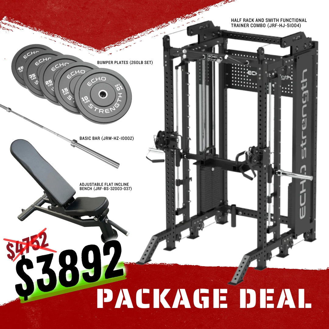 Echo Strength – Half Rack & Smith Functional Trainer Combo, Adjustable Bench, Barbell & Bumper Plates